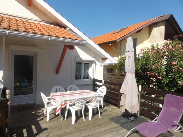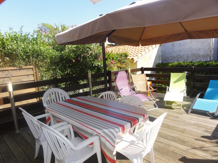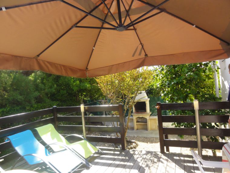 A l’arrière sa vaste terrasse en bois ,véritable lieu de vie, ajoute une cerise sur le gâteau des vacances. Arborée et entièrement protégée elle offre des bains de soleil, un parasol à mât déporté, des colonnes électriques pour que se conjuguent près du barbecue en pierre, repos, détente et repas en plein air.