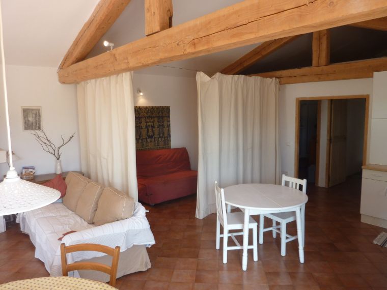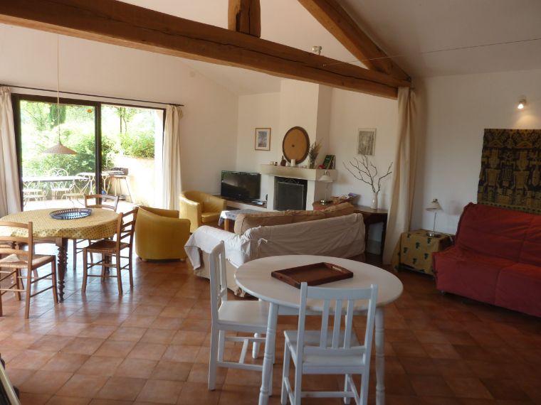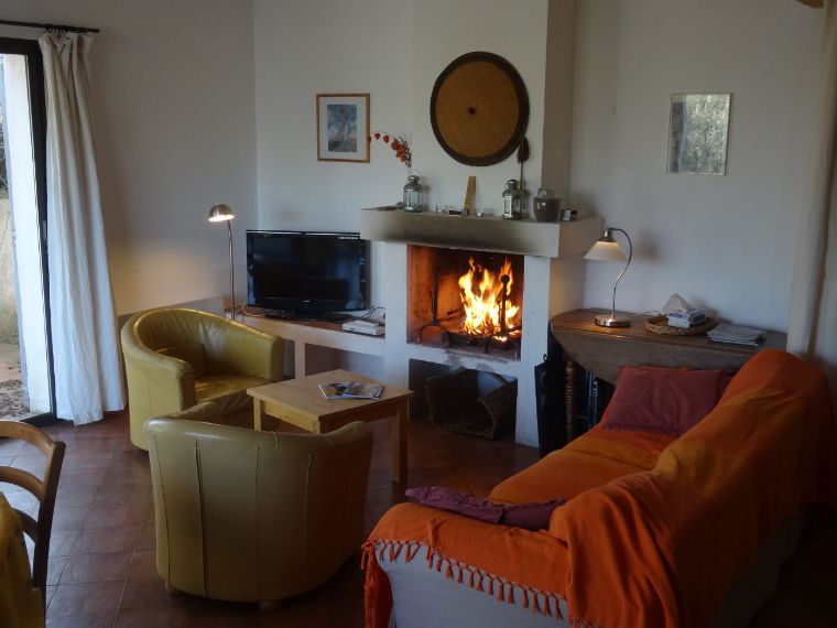 A l’intérieur , une grande pièce séjour-salle à manger-cuisine de 56 m2 avec deux grands baies vitrées donnant sur les terrasses et les oliviers .Elle est équipée d’un canapé 3 places, table basse, fauteuils, cheminée, téléviseur, radio.