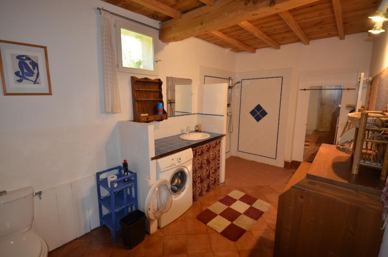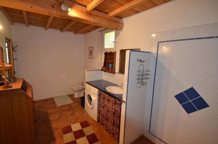 La salle de bain fait 8 m2 avec une vaste douche a l’italienne, WC, lave-linge et commode / table a langer
