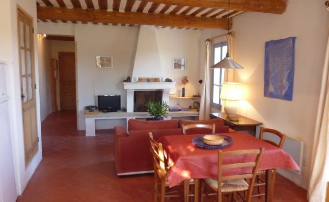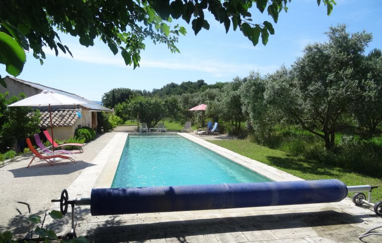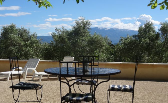 Vaste vue dégagée sur le Mont Ventoux et les Dentelles de Montmirail. Terrasse privative d’environ 100 m2 au milieu d’une oliveraie de 10 ha .