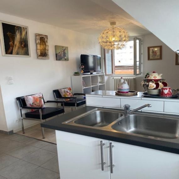 Cuisine ouverte sur un salon avec un canapé lit d’appoint en 140.