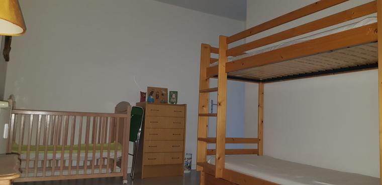 Une chambre avec 2 lits de 90, un lit superposé avec deux couchages en 80 et un lit bébé;