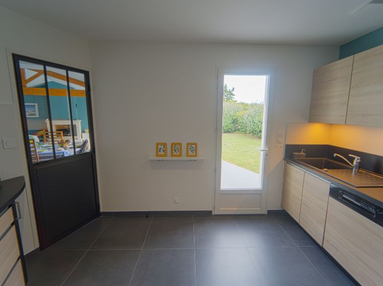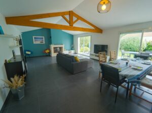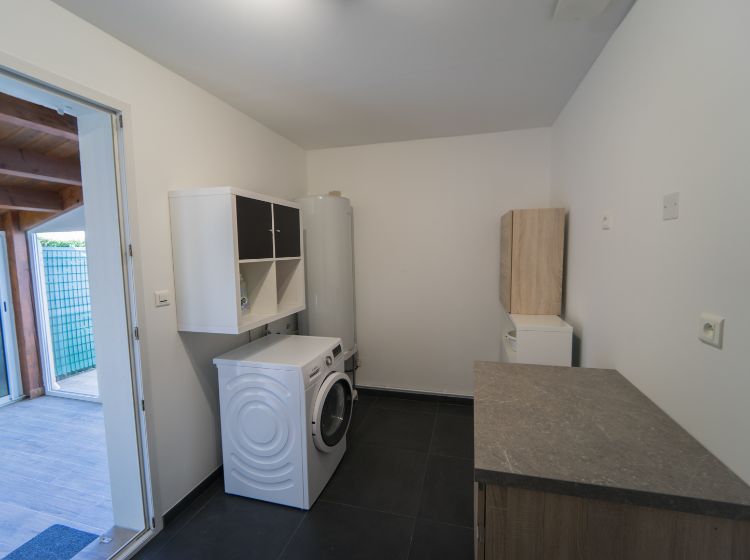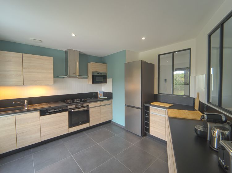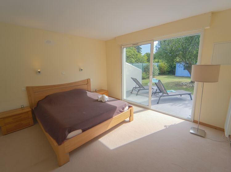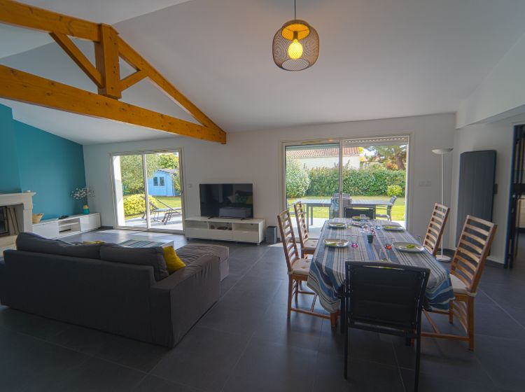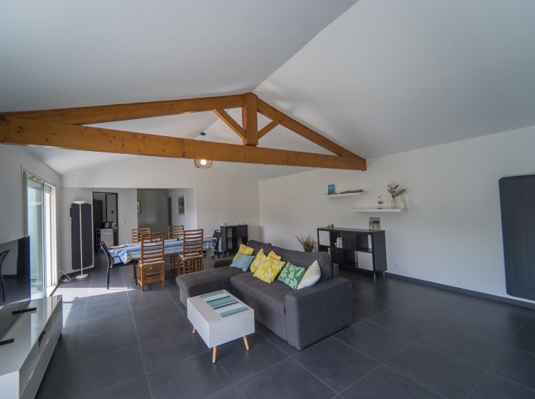 Le vaste séjour et la cuisine séparée offrent un accès direct à la terrasse et au jardin clôturé et arboré de 800 m2. Le patio vous apporte sa fraicheur durant les périodes estivales
