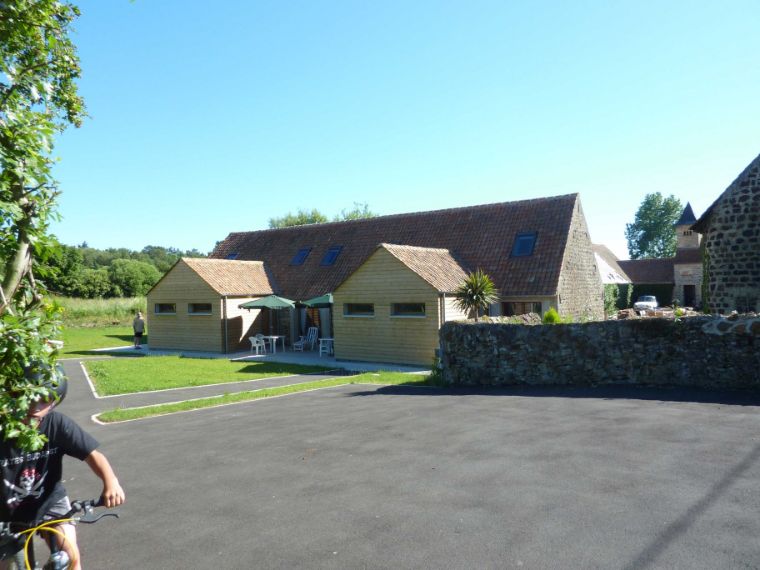 Terrasse privative avec mobilier de jardin et barbecue. Parking et jardin communs aux 3 gîtes.