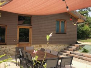 De plain pied avec la terrasse, une grande pièce à vivre avec cuisine toute équipée et grande table, coin salon poele à bois.