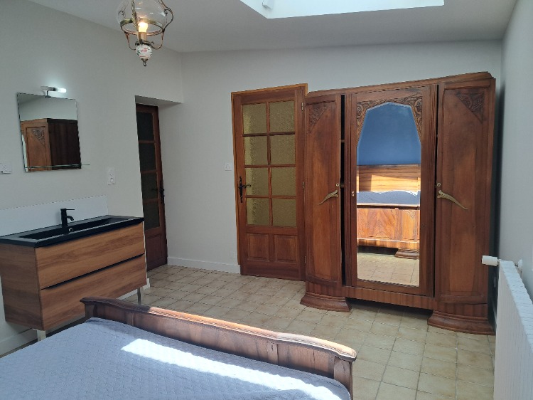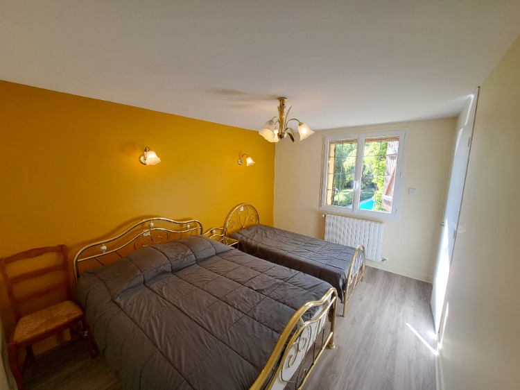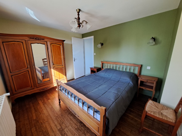 Couchages : A l’étage, une chambre, moyenne, avec un lit de 140, une autre, moyenne aussi, avec un lit de 140 plus un lit de 90.