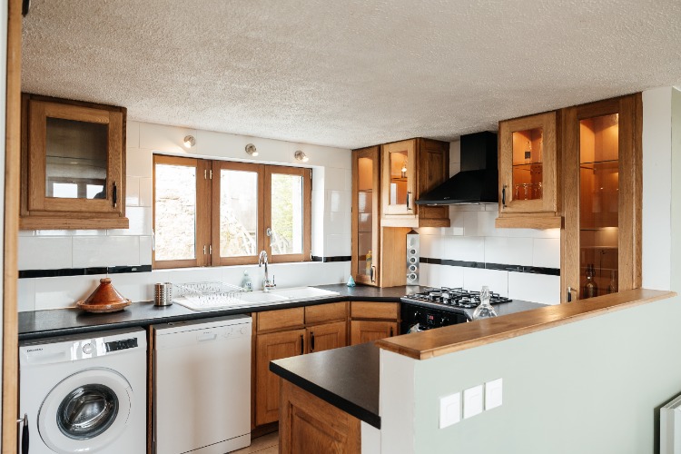 plaque cuisson, four, micro-ondes, cafetière, grille-pain, réfrigérateur, bouilloire électrique et ustensiles de cuisine.