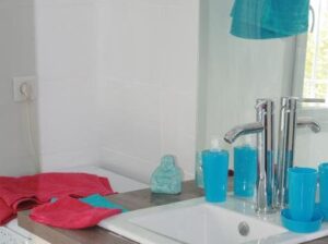 La salle de bain est spacieuse, et composée d’une machine à laver, douche, wc, table à repasser, fer à repasser, sèche cheveux, pèse personne…