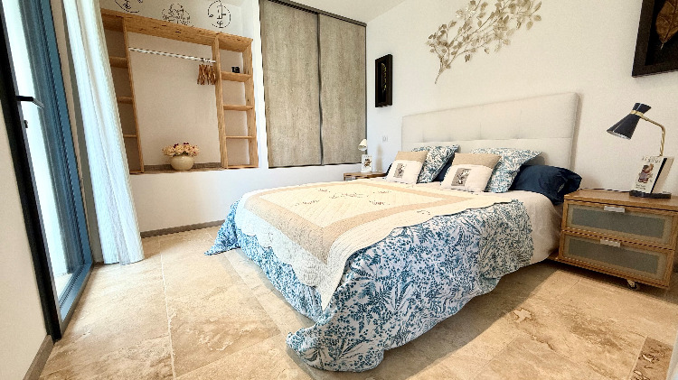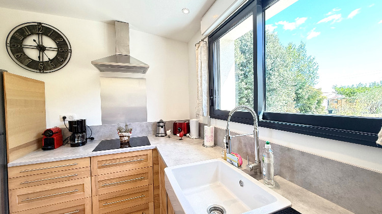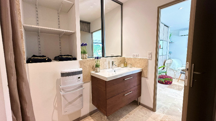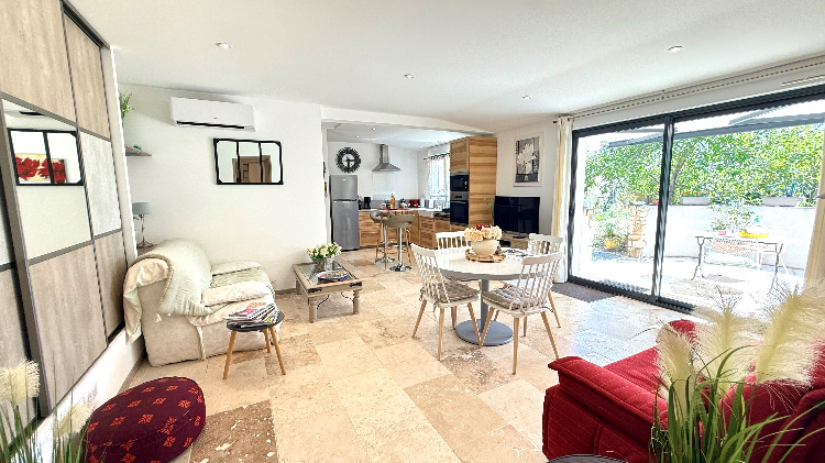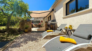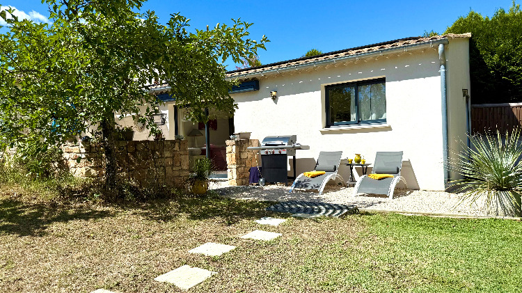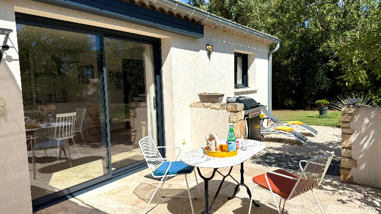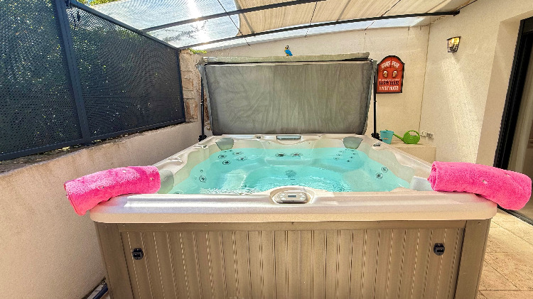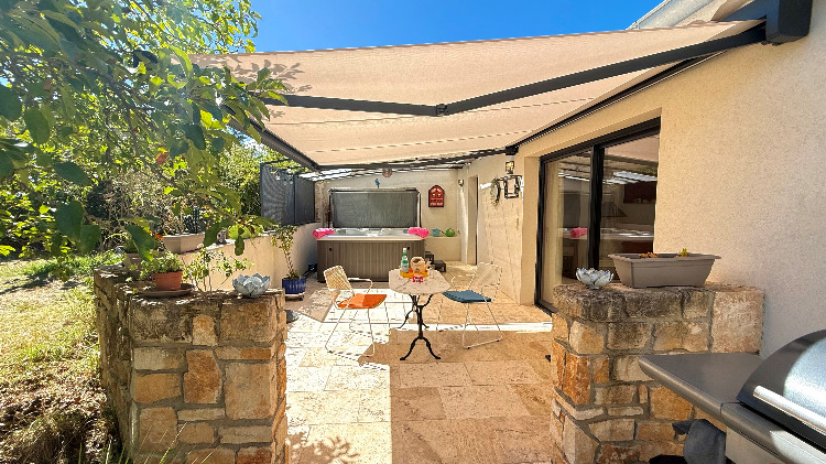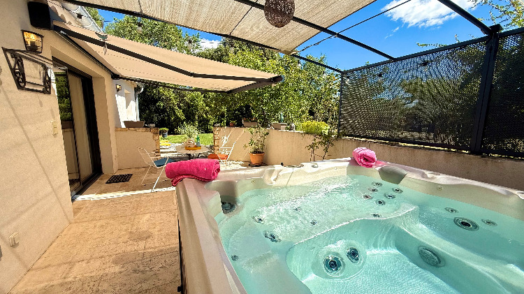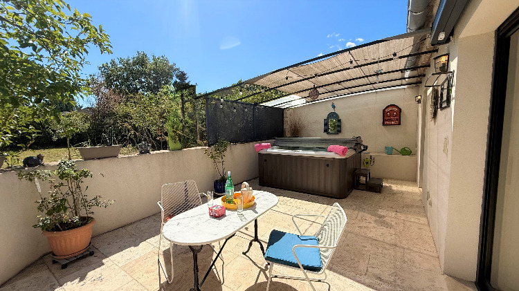 Sans vis à vis et orientée au levant, sa grande terrasse avec tonnelle et store télécommandé abrite un spa de massage privatif, un coin repas avec barbecue gaz, bains de soleil et parasol.
