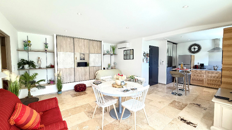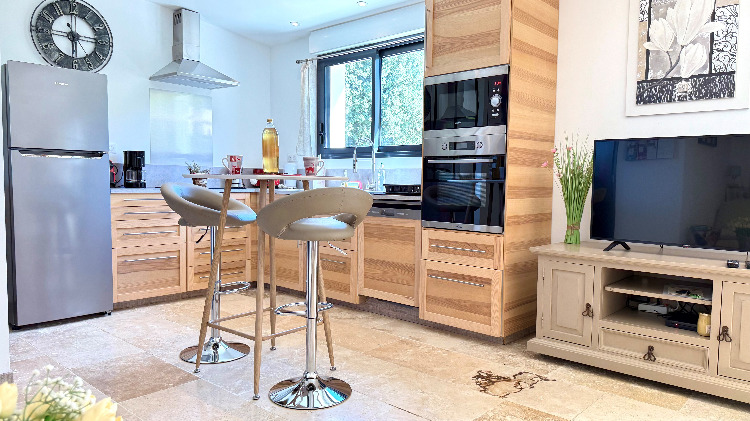 Voir les 32 photosAvec ses 55m2 habitables cette petite maison bénéficie de tout le confort nécessaire et au-delà. Elle comprend un spacieux salon climatisé avec cuisine intégrée toute équipée, chambre avec lit en 160×200, salle de bain avec douche à l’italienne, buanderie avec lave linge et sèche linge, ainsi que tous les équipements nécessaires à un agréable séjour.