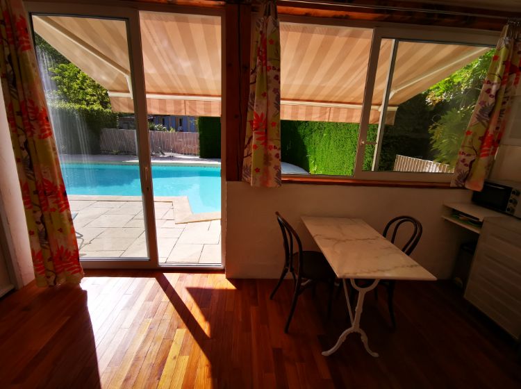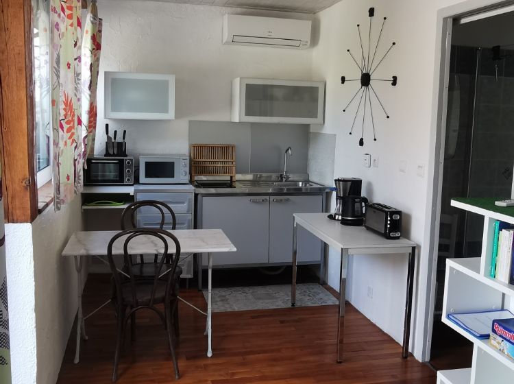La kitchenette dotée d’une climatisation réversible est équipée d’une table bistrot avec 2 chaises, micro ondes, mini four, réfrigérateur avec petit congélateur. Des livres, jeux de société et des informations touristiques sont à votre disposition.
