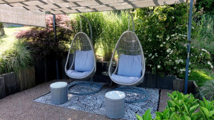 L'espace détente extérieur avec ses fauteuils suspendus.