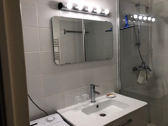 La salle de bains est équipée d’un lave-linge, d’un lavabo et d’une douche spacieuse.