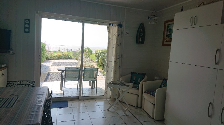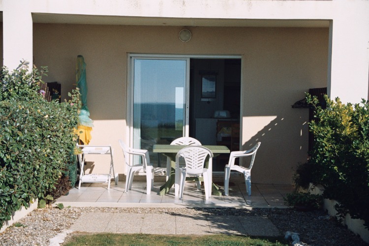 Terrasse avec mobilier de jardin et jardinet avec vue imprenable sur l’océan , accès direct plage située à 50 m de l’appartement