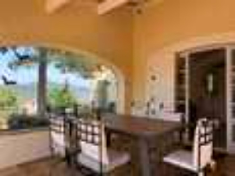 Salle à manger avec grandes portes vitrées donnant sur la terrasse et piscine.