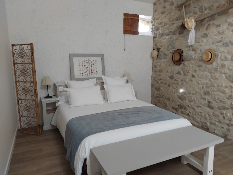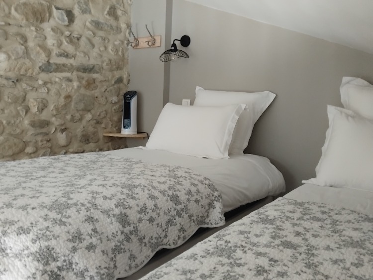 La chambre est meublée avec soin, les lits sont dotés de 2 oreillers chacun et d’une couette 4 saisons pour les lits individuels, un traversin complète la literie sur le grand lit.