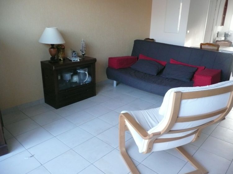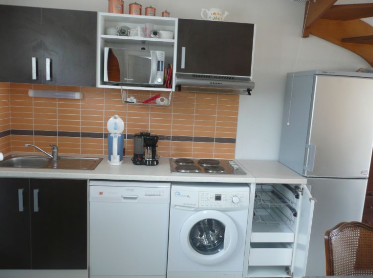 Le premier étage est constitué d’une terrasse vue sur mer avec salon de jardin (rapidement ombragée dans la matinée) , d’un séjour avec un côté cuisine équipé de 4 plaques électriques, grill-micro-ondes, lave linge, lave vaisselle