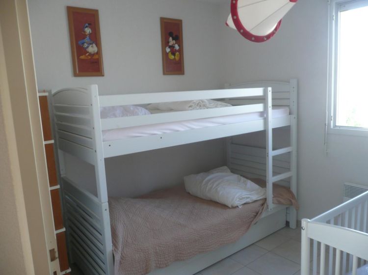 – une chambre avec deux lits superposés, un lit bébé et un placard intégré