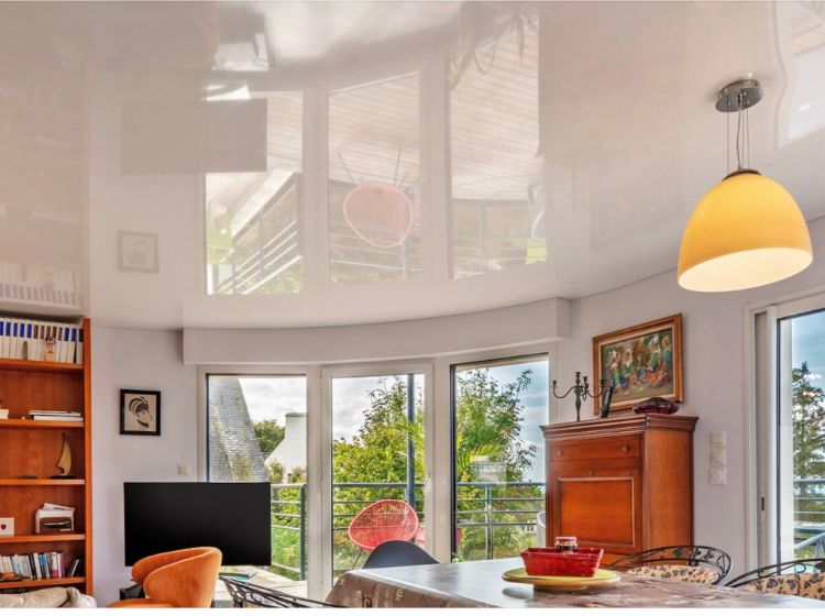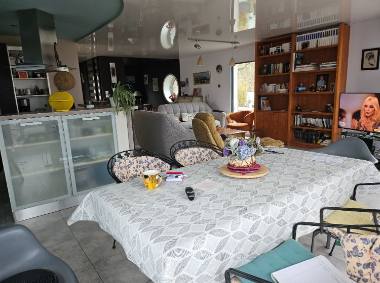Le sejour avec ses grandes baies sa toile tendue au plafond les canapés confortables le coin cuisine et le coin repas et sa terrasse en L pour profiter des belles journées sont a l étage avec une salle d’eau wc