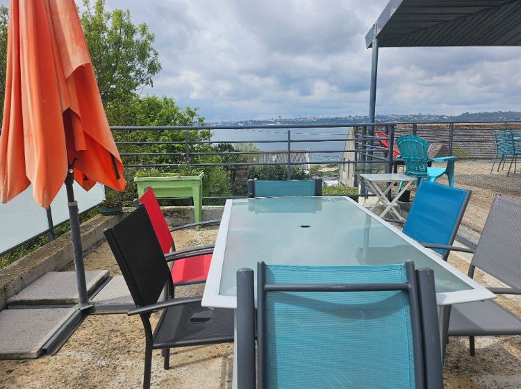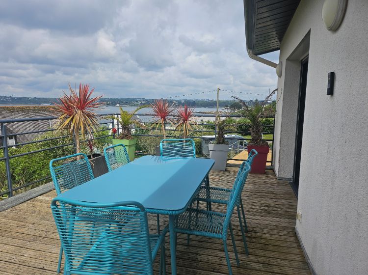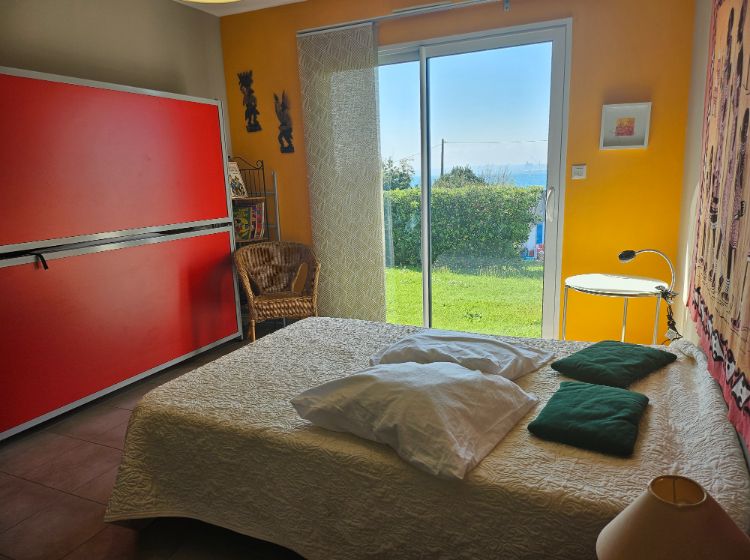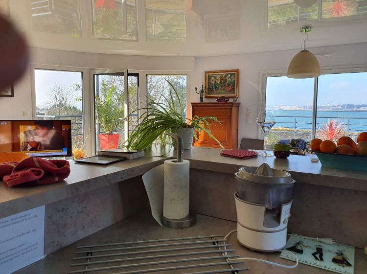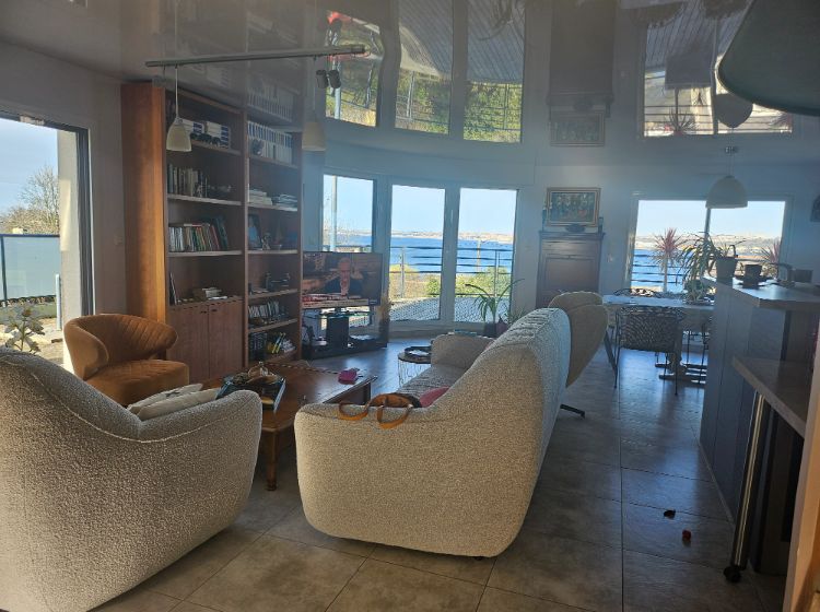 Avec son grand sejour très ensoleillé avec vue mer ou que vous soyez assis …comme dans un bateau on dit des vacanciers ..