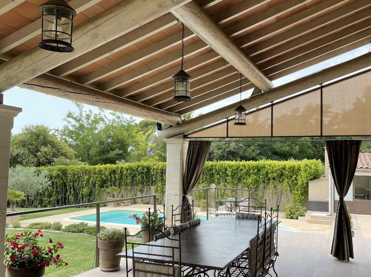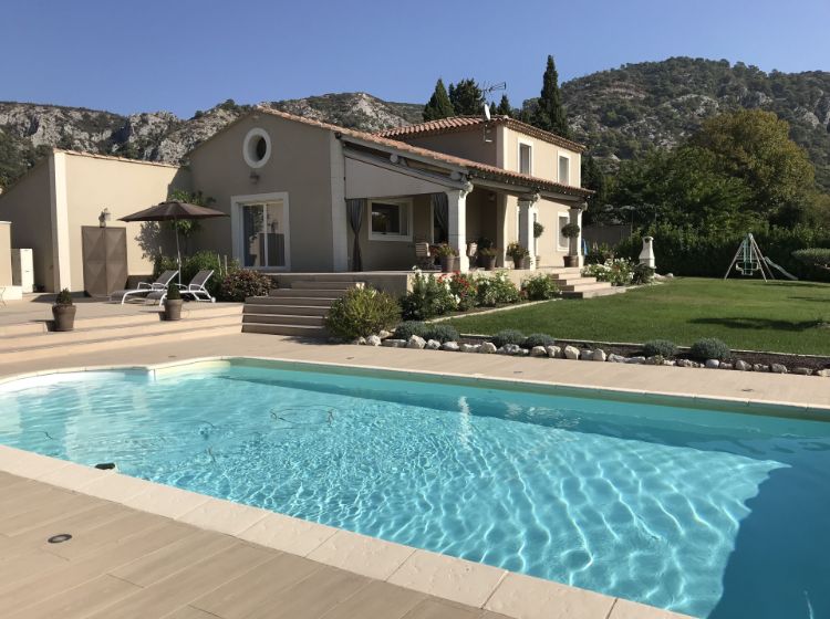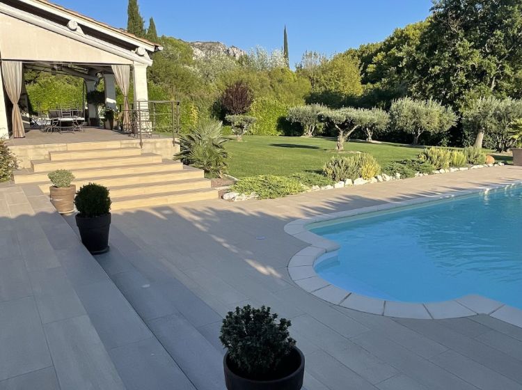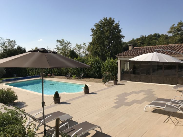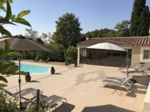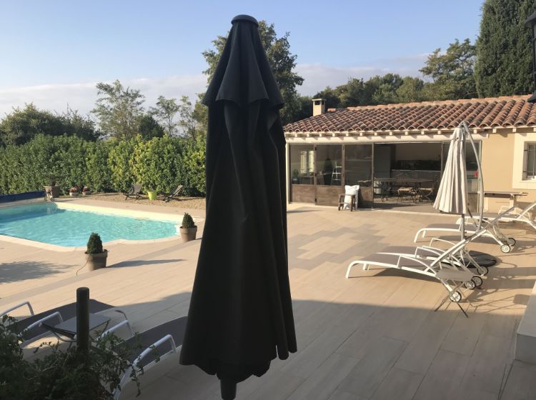 La villa dispose d une piscine 10X5m avec alarme, une grande plage avec des bains de soleil pour votre plus grand confort ainsi qu’un pool house avec cuisine d’été, wc et douche.
