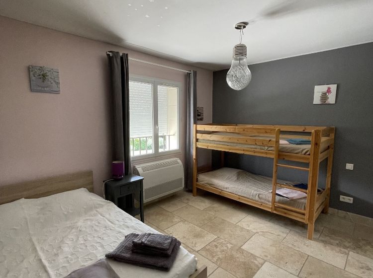 A l’étage 3 chambres dont une avec 1 lit en 140cm, une autre avec 1 lit en 140cm + 1 lit superposé de 2x 90cm et la dernière 2 lits en 90cm , avec une salle de bain et wc séparé