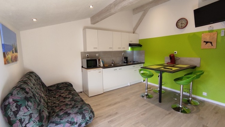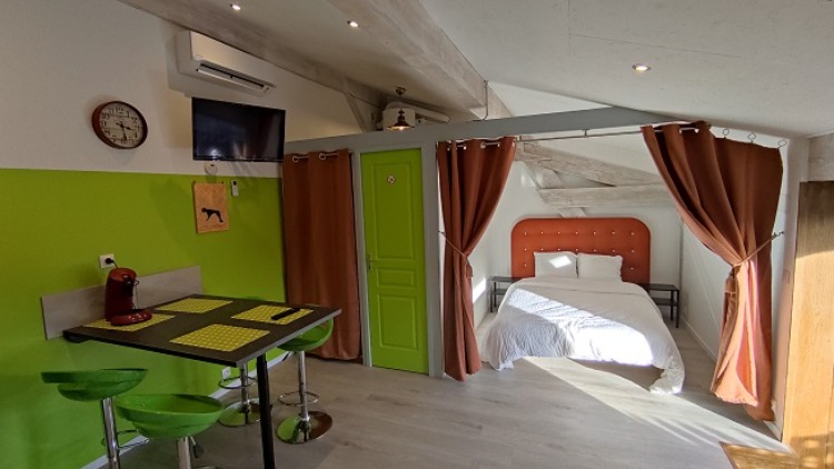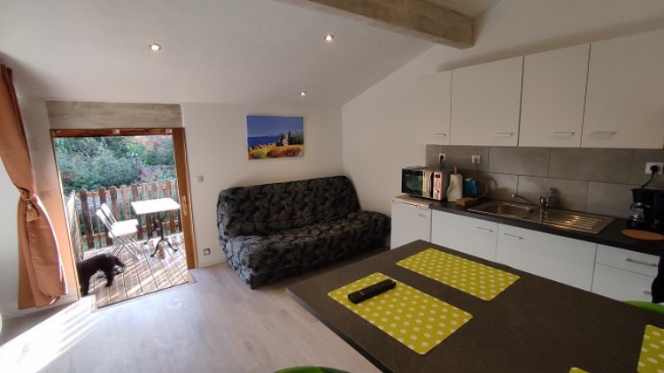 Voir les 9 photosLe gite du P’tit bonheur de 2 personnes avec chambre équipé d’un lit en 140 cm, d’une salle de bain avec WC, 1 pièce à vivre avec coin-cuisine intégré, un coin-salon TV et clic-clac ainsi qu’une terrasse avec plancha