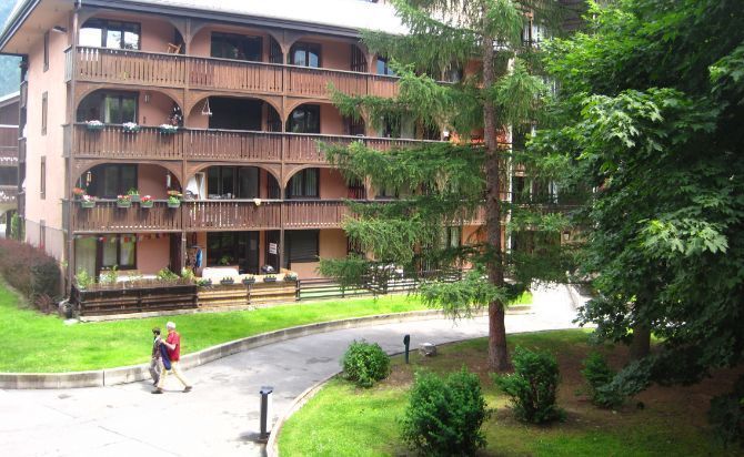 Quartier résidentiel piéton de Chamonix-Sud qui fait face au téléphérique de l'Aiguille du Midi (3842 m)