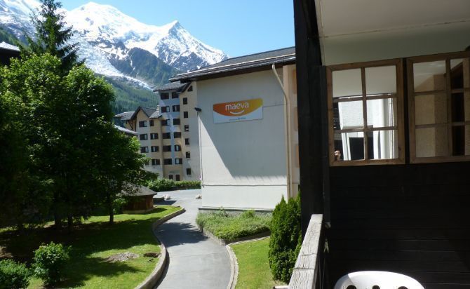 Balcon avec salon de jardin et transat (sauf hiver) pour manger face au massif du Mont-Blanc.