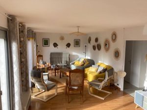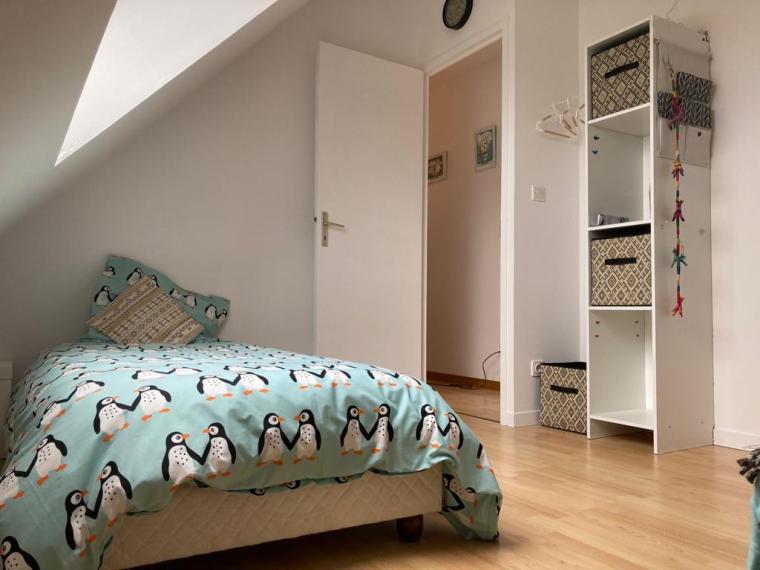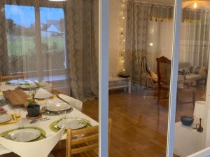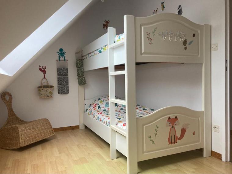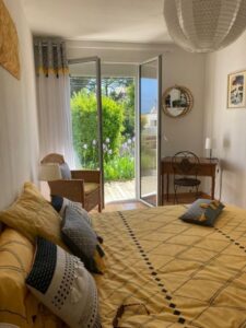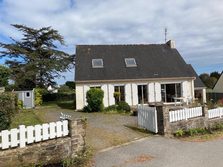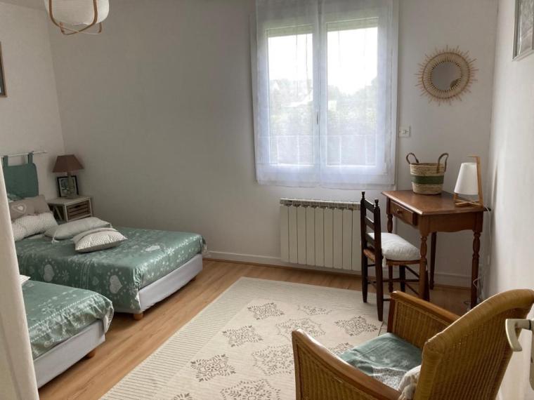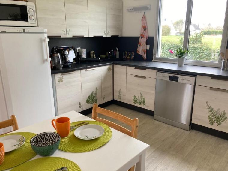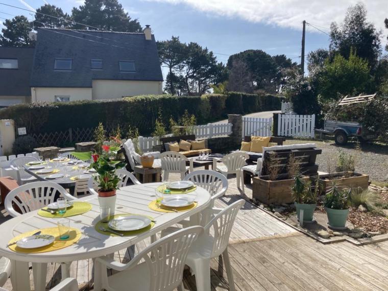 Voir les 14 photosMaison très lumineuse (et ensoleillée). Grand séjour (40 m2) avec canapés et fauteuils, grande télévision, table pour 12 convives, cuisine attenante équipée (lave-vaisselle, four micro-ondes, cuisinière induction, réfrigérateur grand volume) avec verrière donnant sur le salon-salle-à-manger, 2 grandes chambres, une avec un lit 160 et l’autre avec deux lits de 90 pouvant être rapprochés, WC séparés, salle de bain avec baignoire – commode pour les enfants- et douche ; à l’étage, salle de douche avec WC, chambres mansardées plus petites (dont deux avec petite vue mer): une chambre avec un lit de 160, une chambre avec un lit de 90 et deux lits gigognes de 90, la troisième possède deux lits superposés de 90 et un lit simple de 90. Garage avec lave-linge, sèche-linge, congélateur, mais non utilisable pour garer une voiture. Parking dans le jardin. Terrasses avec table et chaises, salon de jardin, transats. Chauffage électrique et poêle à bois.