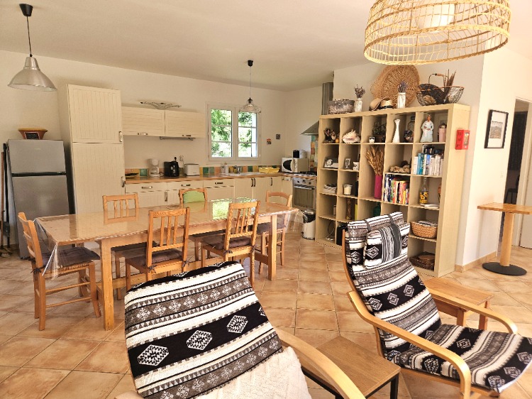 La table familiale pour les repas et le coin bibliothèque.