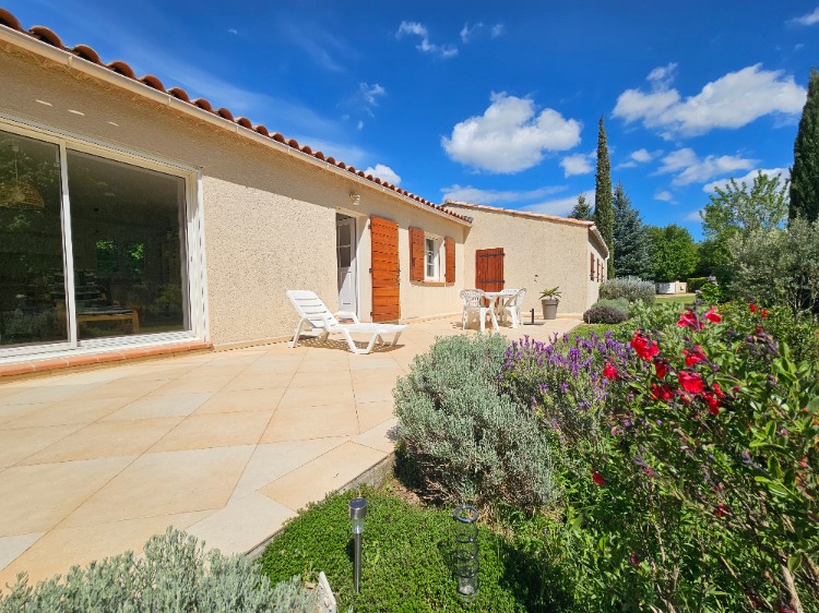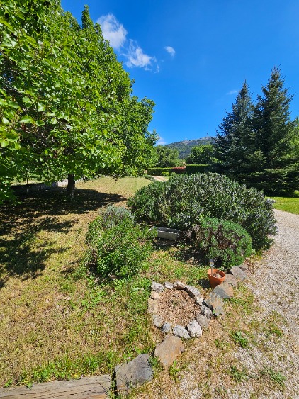 Terrasse baignée de soleil sur un terrain clôturé et arboré de 4000m2.