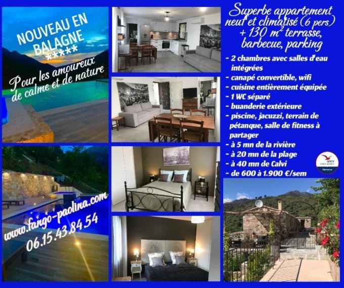 Sur un terrain clôturé de 2.500 m² environ, 3 gîtes neufs et climatisés à 5 mn de la rivière et à 20 mn de la plage, dans un véritable havre de paix, lieu idyllique en Balagne avec vue panoramique sur la Vallée du Fango :