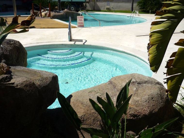 Solarium dans le jardin aux 3 piscines. 1 piscine ronde de 12m de diamètre, bassin enfants avec cascade, bain à remous avec cascade