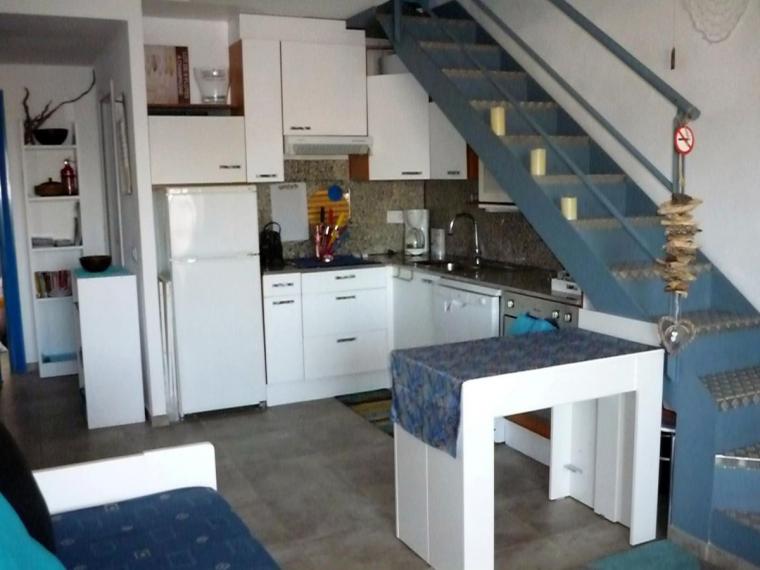 Cuisine américaine avec sa grande table console de 2 à 10 personnes. (4 Rallonge supplémentaire le long du frigo). Grand four et micro-ondes, plaques induction, combi frigo-congélateur, lave-vaisselle / linge, vaisselle pour 6 Extincteur + détecteur de fumée