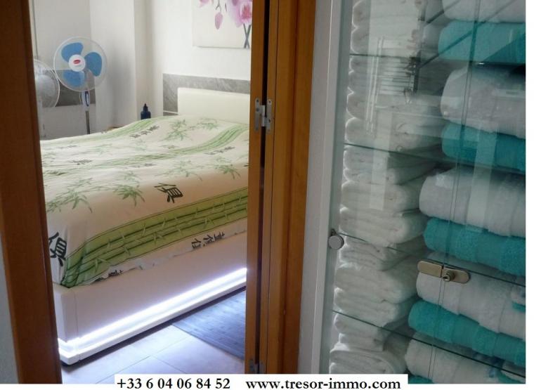 1 lit de 150x190cm, placards, pouf, portant de vêtement. Fenêtre sur la marina
