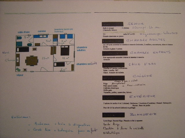 | Alarme | Equipement bébé | Douche | Cheminée ou poêle à bois | Ventilateur | DVD ou vidéos à la demande | Livres de bibliothèque | Jeux de société |