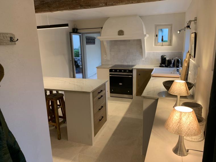 A l’entrée du mazet, un petit hall donne à droite sur la cuisine rénovée en 2021, devant sur les WC ‘invités’ et à gauche sur le séjour d’où on accède au salon et à l’étage par un escalier en pierres de taille.