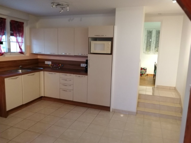 – une cuisine ouverte équipée d’un réfrigérateur/conservateur, un micro-ondes, un lave-vaisselle, un lave-linge,