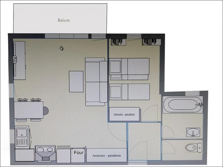 Deux pièces de 35 m2 comprenant entrée, couloir avec grand placard, cuisine équipée: lave vaisselle ,plaque 4 feux induction, four + micro-ondes, 2 cafetières: filtre + Nespresso, bouilloire, appareil à raclette…