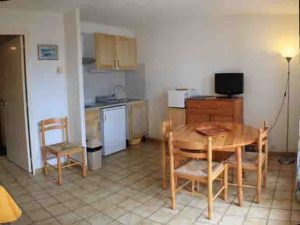cuisinette micro onde, frigo congélateur, bouilloire, grill, batterie de cuisine et vaisselle.