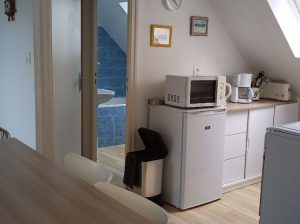 Vous y trouverez un coin cuisine bien équipé, un espace salon avec son canapé et sa table basse.