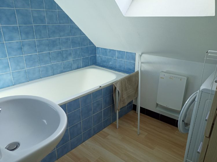 Les toilettes sont séparées de la salle de bain, celle-ci est équipée d’une baignoire.