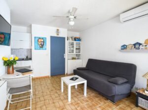 La pièce principale est équipée : d’un coin cuisine avec nombreux rangements, meuble en pin, vaisselier d’un canapé lit en 140 avec matelas en mémoire de forme, d’un ventilateur à pales et d’une climatisation réversible.