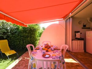 Terrasse 18M2 (1 table+5 chaises) agrémentée d’un jardin ombragé et clôturé de 50M2.