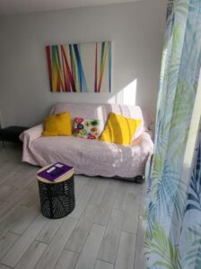 Appartement au rez de jardin dans une résidence de 3 appartements et d’une roulotte. Cuisine aménagée avec coin salon. Une chambre avec 1 lit double, une chambre avec 2 lits 1 personne, salle de bain. WC séparé. Résidence fermée et sécurisée. Place de parking. Spa et sauna en supplément.