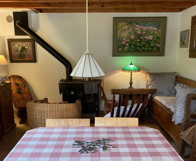 Le lit baldaquin double (160) a un bon matelas latex. Les toilettes à compost sont séparées. Dans la cuisine il y des plaques électriques et une cuisinière à bois avec four pour usage en dehors de la saison chaude.