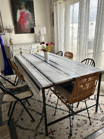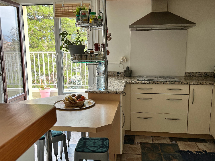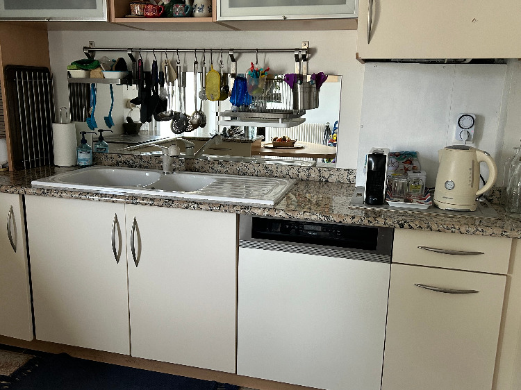cuisine donnant sur un autre balcon (7 m2) équipée, lave-vaisselle, réfrigérateur-congélateur, four électrique, plaque 3 feux à induction, grille-pains, bouilloire électrique, casseroles, poêles, plats divers, vaisselle, linge de table …