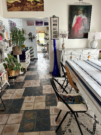 Vue d'ensemble salle à manger, entrée, cuisine au fond avec son balcon