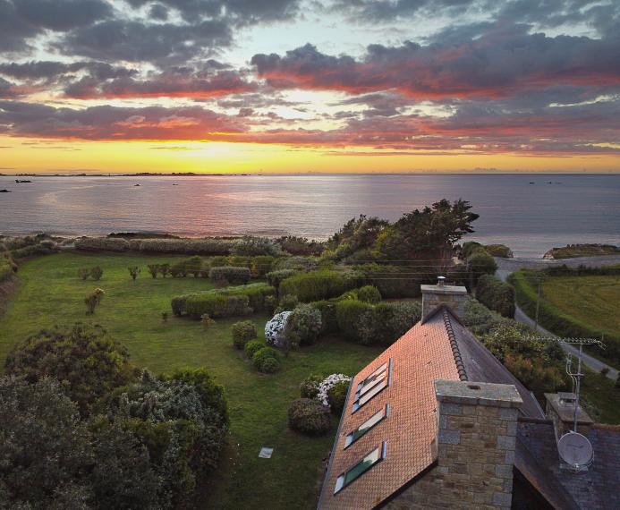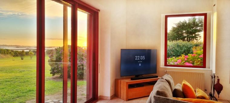 Le salon capte les couleurs du soleil couchant sur la baie de Kermagen